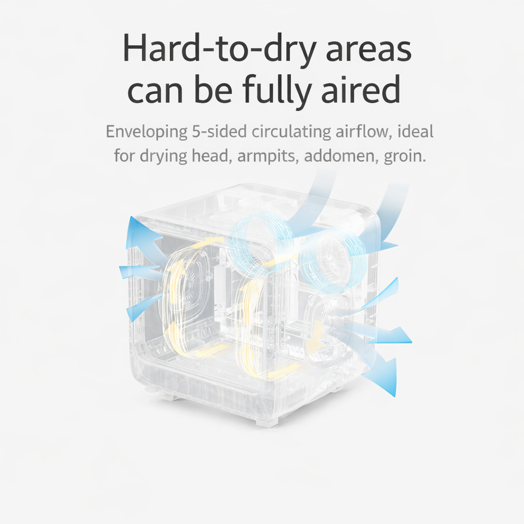 Even airflow reaches hard-to-dry areas like the belly, legs, and underarms.